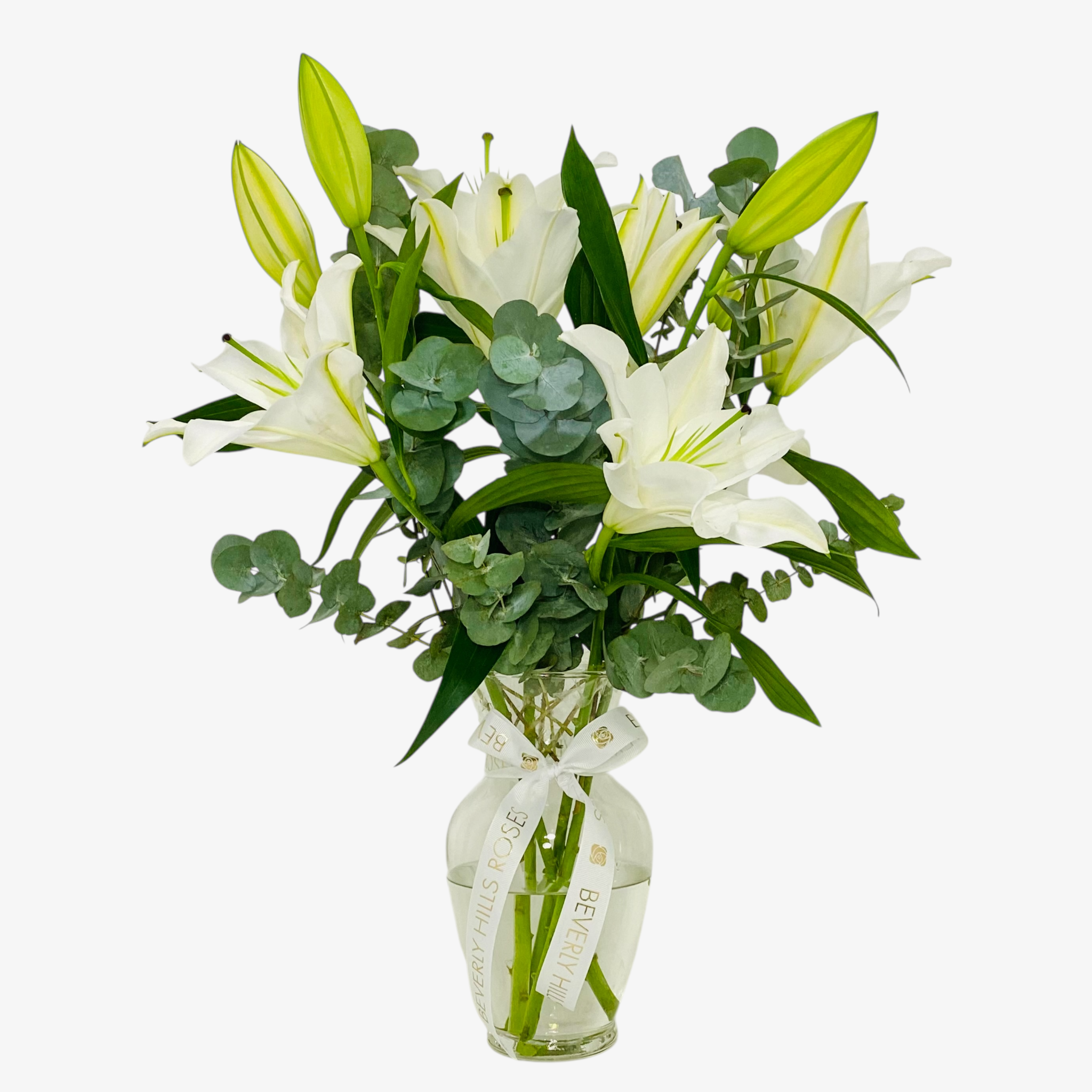 Order your White Lilies with Eucalyptus Vase today from Beverly Hills Roses and bring natural elegance to your home, office, or work table. Perfect for gifting or brightening your everyday surroundings.